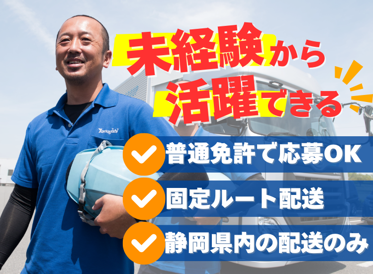 お仕事内容 | 大手コンビニエンスストアに常温商品を配送しています。主な荷物は飲料や加工食品で、すべてカゴ台車での積まれています。カゴ台車をトラックに積み卸しするので、体への負担は少ないです。 配送エリアは静岡県中部エリアです。 静岡県から出ることがなく、毎日家に帰ることができるため お仕事とプライベートのバランスが取れた求人です。 |